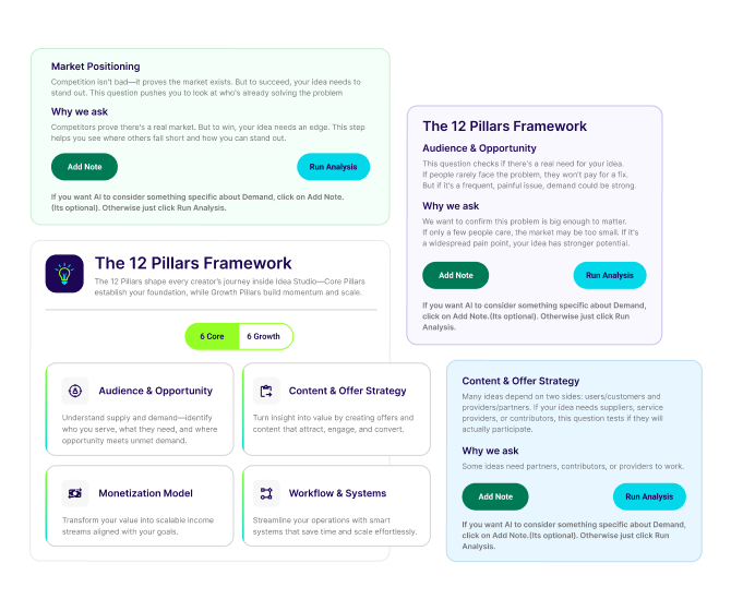 Once your idea takes shape, the Strategy Studio becomes your personal think tank — helping you map, test, and validate your next move through the 12-Pillar Framework that powers My Idea Studio.