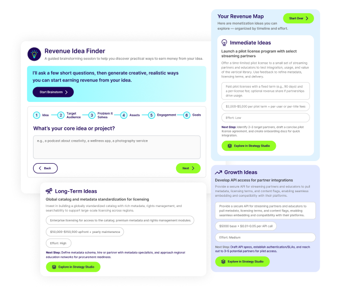 The Revenue Idea Finder uses AI to transform raw thoughts into focused, revenue-ready opportunities. It helps you see where your creativity meets real-world demand — guiding you toward ideas worth building and audiences ready to buy.